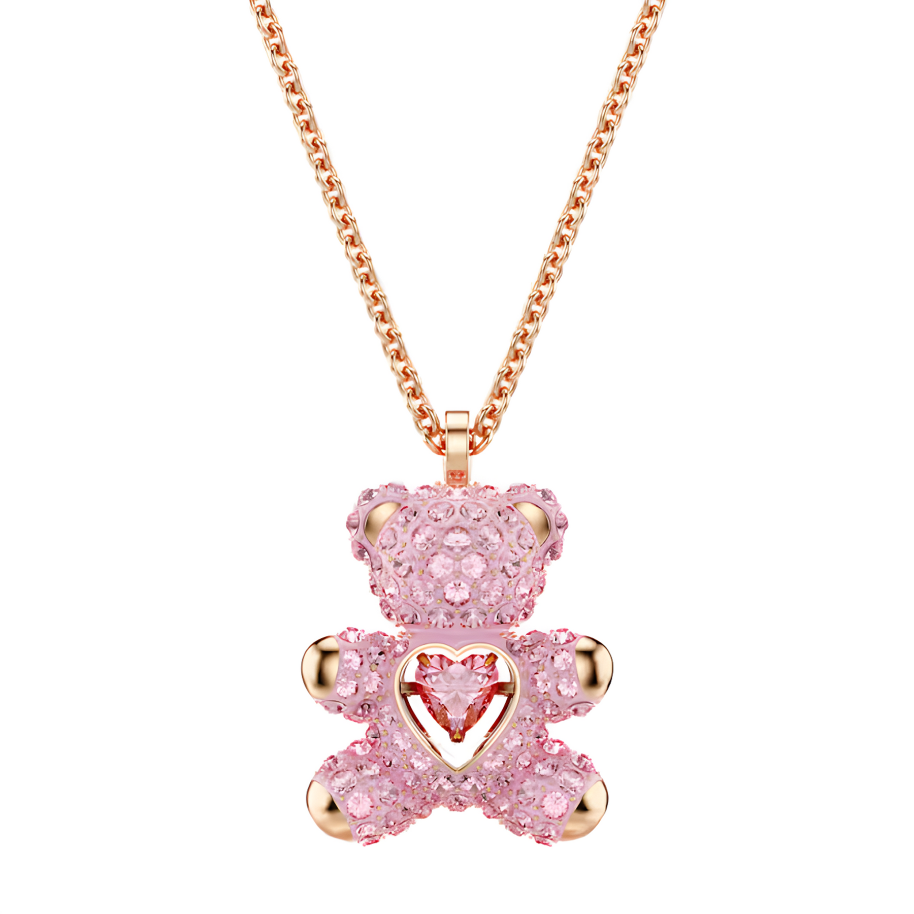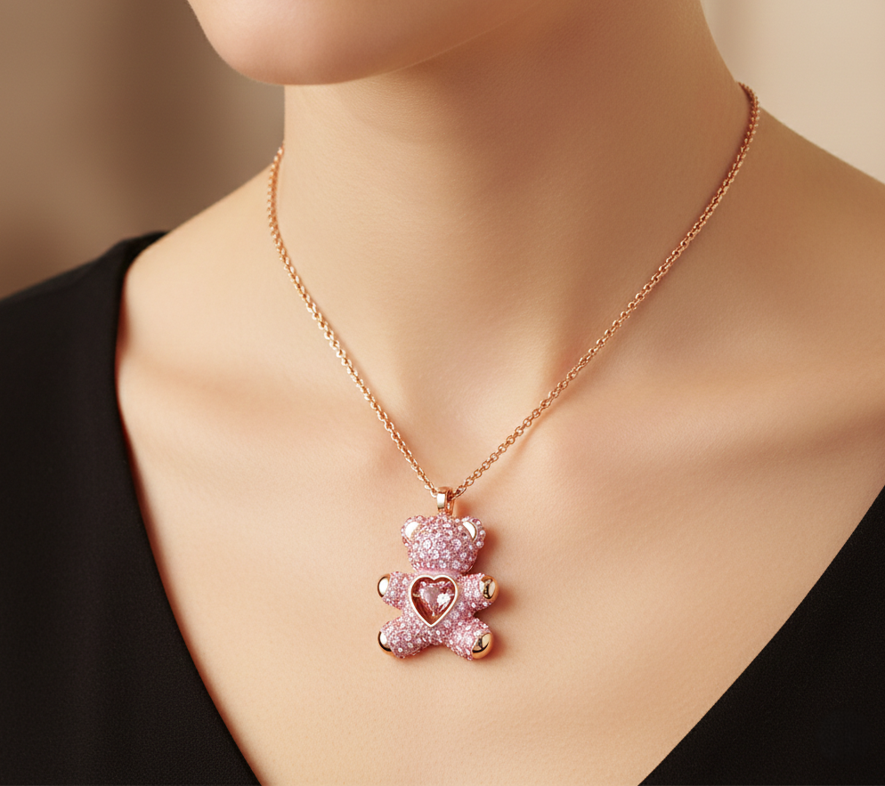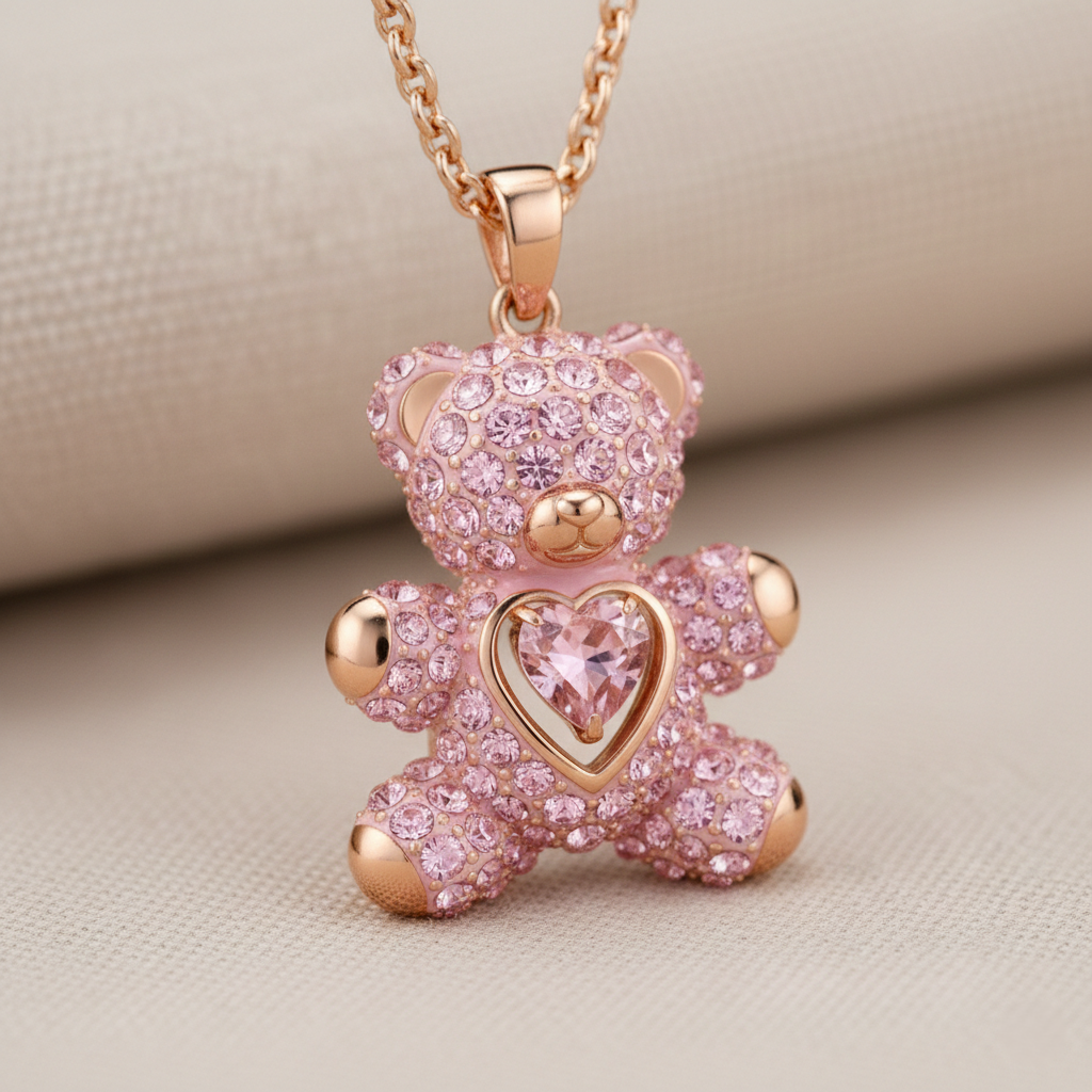 Add a touch of sweetness and sparkle with this Pink Crystal Teddy Bear Necklace. Featuring a charming teddy bear pendant fully encrusted with pink crystals and a heart-shaped gemstone at its center, this rose gold–tone necklace blends cute charm with elegant sparkle.
