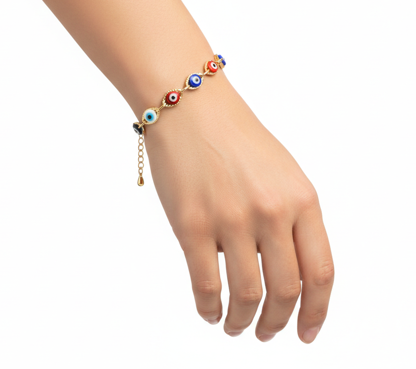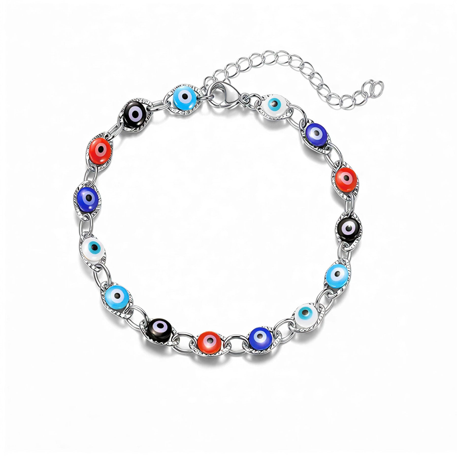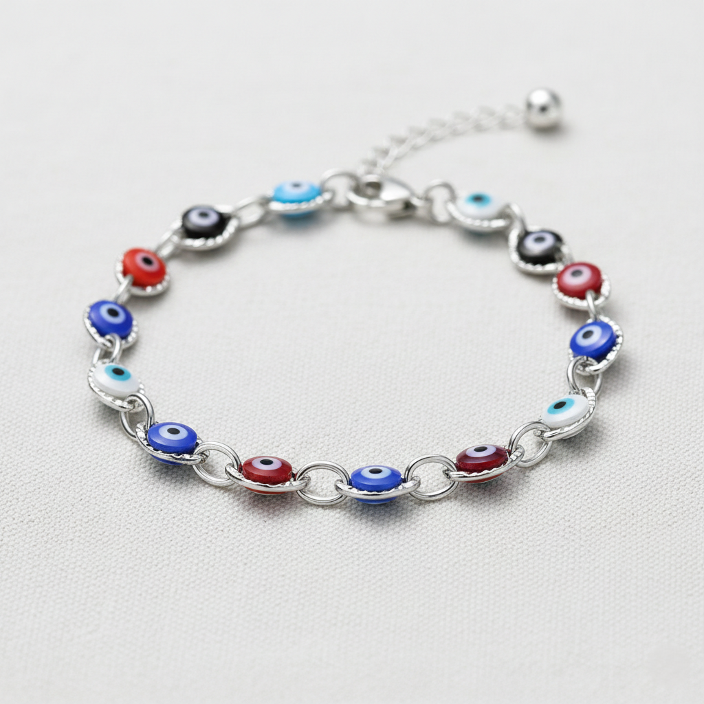 Ward off negativity in style with this Colorful Evil Eye Charm Bracelet. Featuring a series of vibrant enamel eye charms set along a silver-tone adjustable chain, this bracelet blends meaningful symbolism with everyday elegance.
