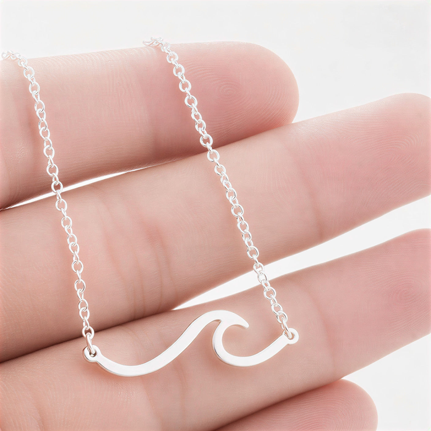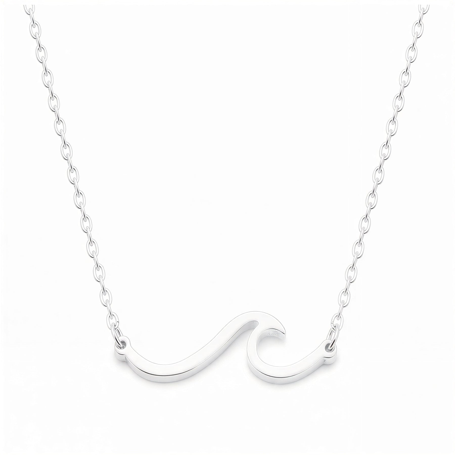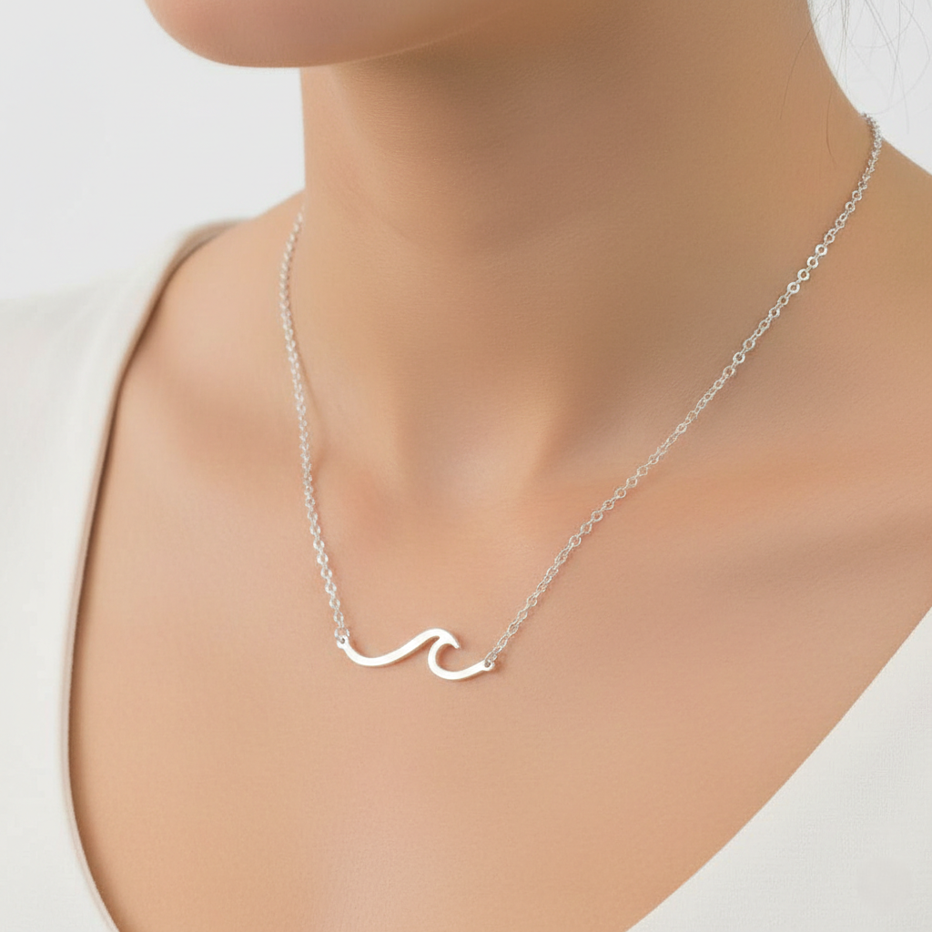 Product code: JUB-NK-023-WAVE Pendant size: approx. 18 mm x 7 mm (wave charm) Material: 925 sterling silver Finish: High polish Chain length: 16–18" (adjustable) Color: Silver