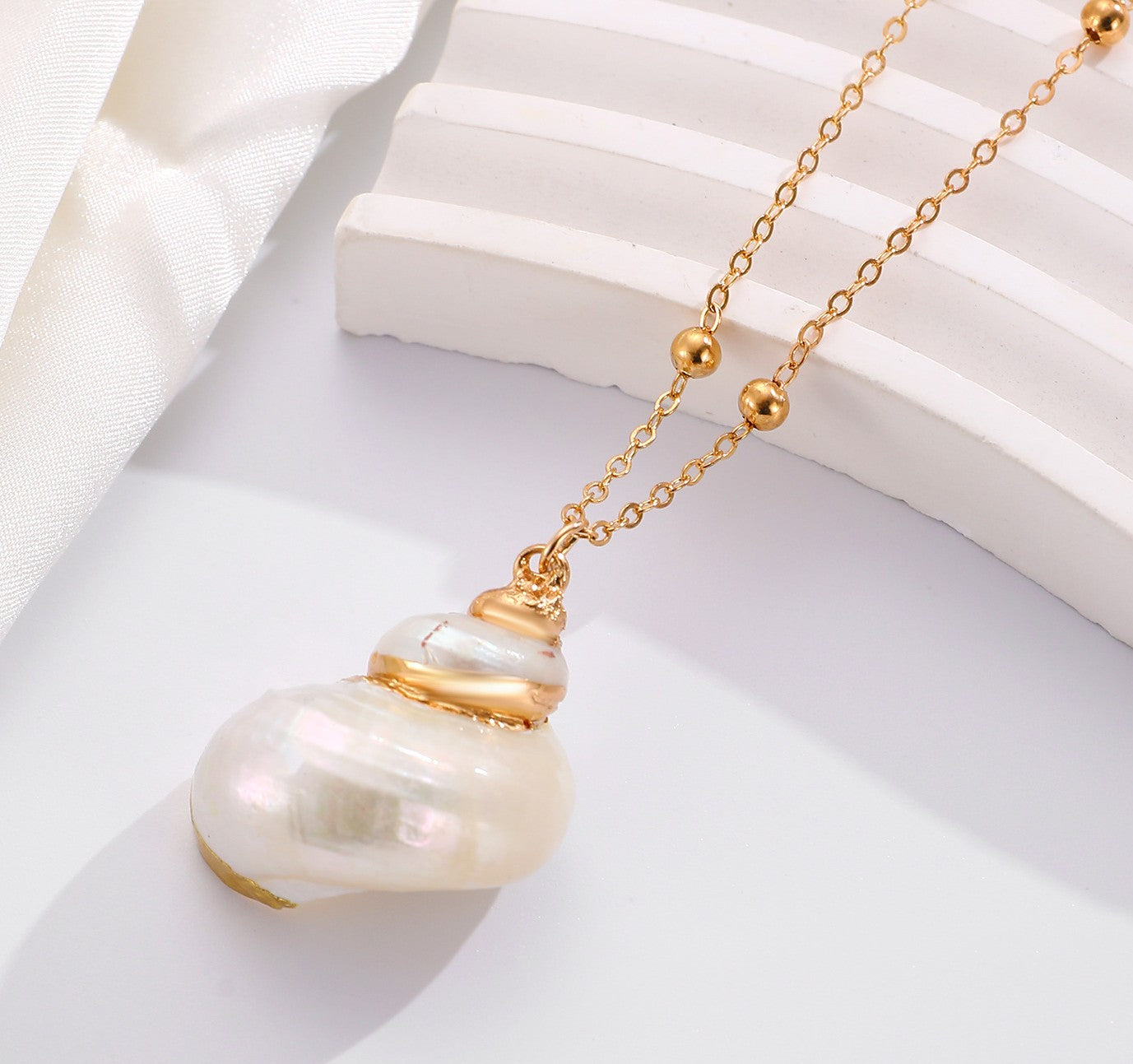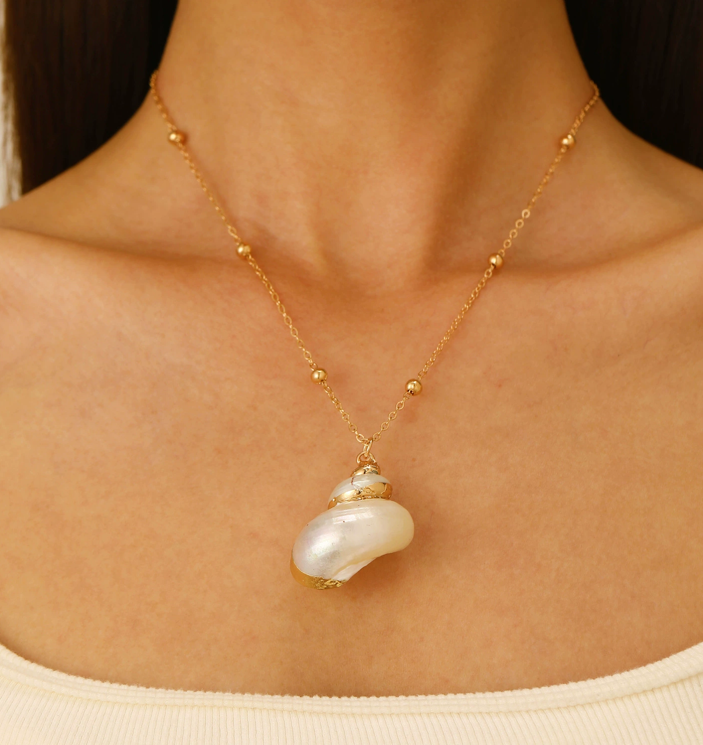 Bring the serene beauty of the sea into your everyday style with this gold-plated natural seashell pendant necklace. Featuring a unique pearlescent shell delicately wrapped in gold-tone accents, this dainty 18-inch chain necklace captures coastal elegance and minimalist charm.