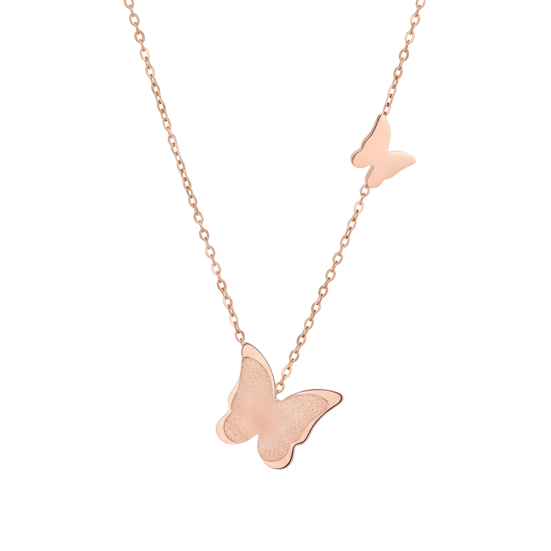 Product code: JUB-NK-021-BUTTERFLY Pendant: Double butterfly charms Material: Rose gold-plated stainless steel Chain length: 18" (45 cm) Color: Rose Gold