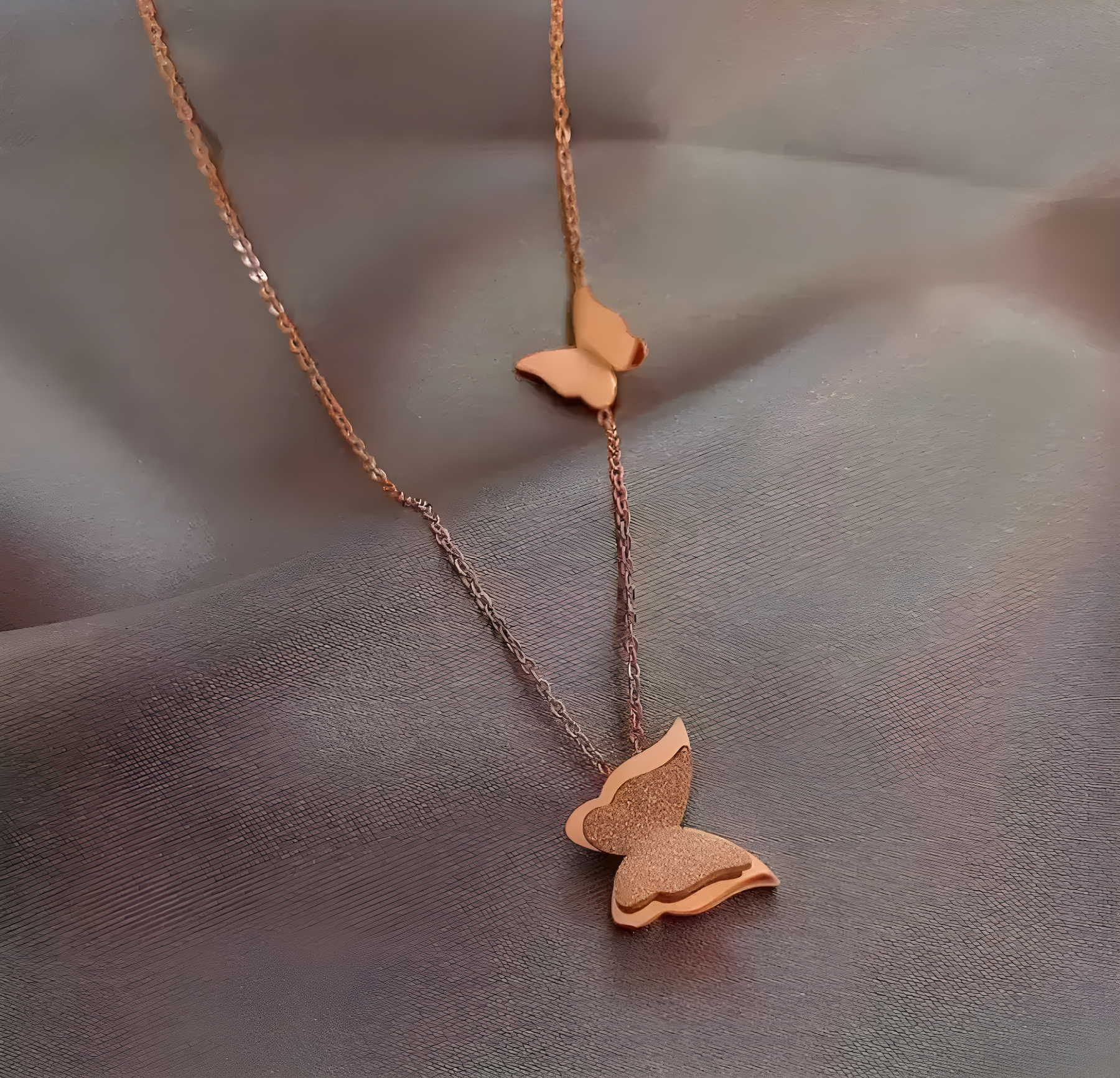 Delicate and feminine, this Rose Gold Butterfly Necklace celebrates freedom, love, and transformation. Featuring a double-butterfly pendant on a fine rose-gold chain, this minimalist layered necklace adds a soft, elegant sparkle to any outfit.