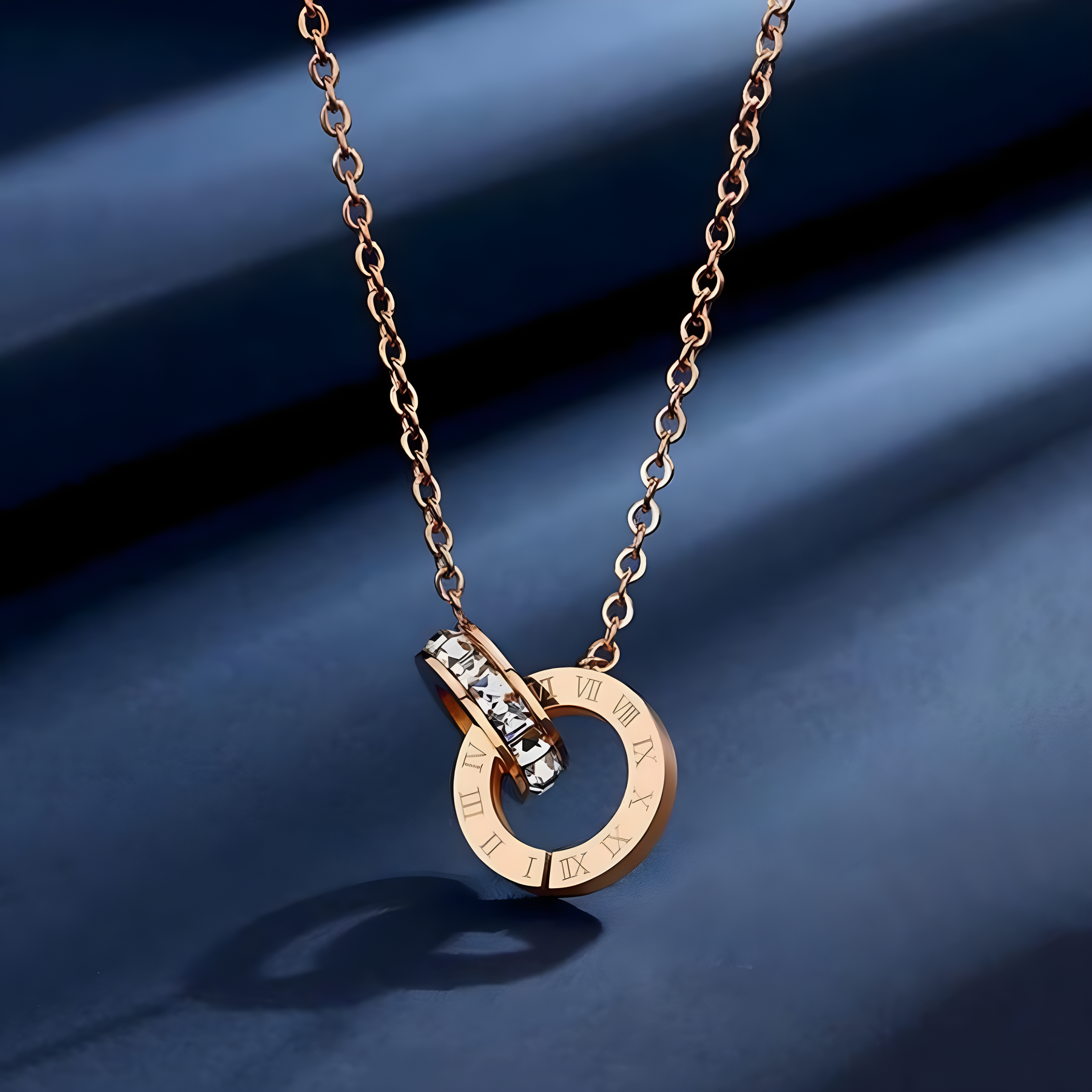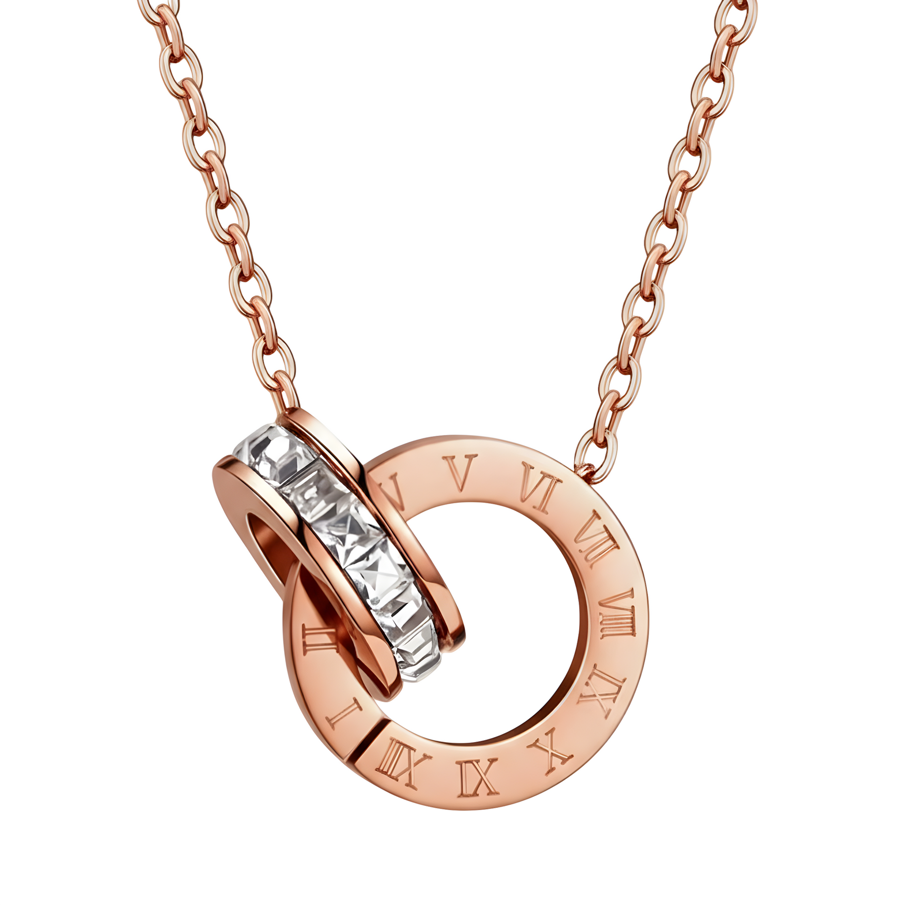 Celebrate eternal love and timeless connections with this Rose Gold Roman Numeral Interlocking Necklace. Featuring two interlocking circles one etched with classic Roman numerals with sparkling crystals this dainty necklace makes a meaningful gift or a cherished addition to your own jewelry collection.