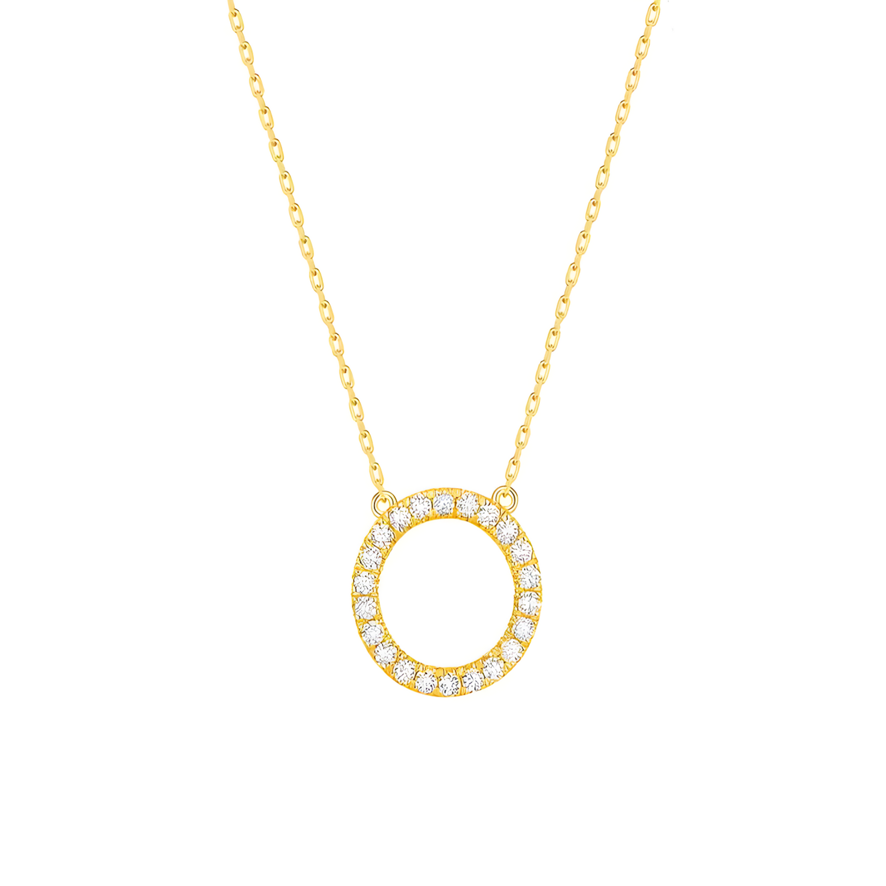 Product code: JUB-NK-032-CIRCLE Pendant size: Approximately 25–30 mm diameter (including connectors) Material: High-quality alloy with gold-tone plating Stone detail: Clear round-cut crystal accents Chain type: Classic fine gold link chain Color: Gold, Silver Style: European & American, modern, minimalist, elegant