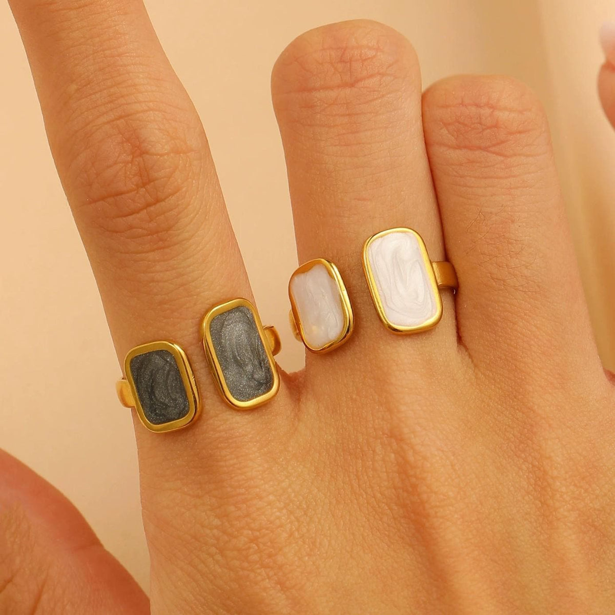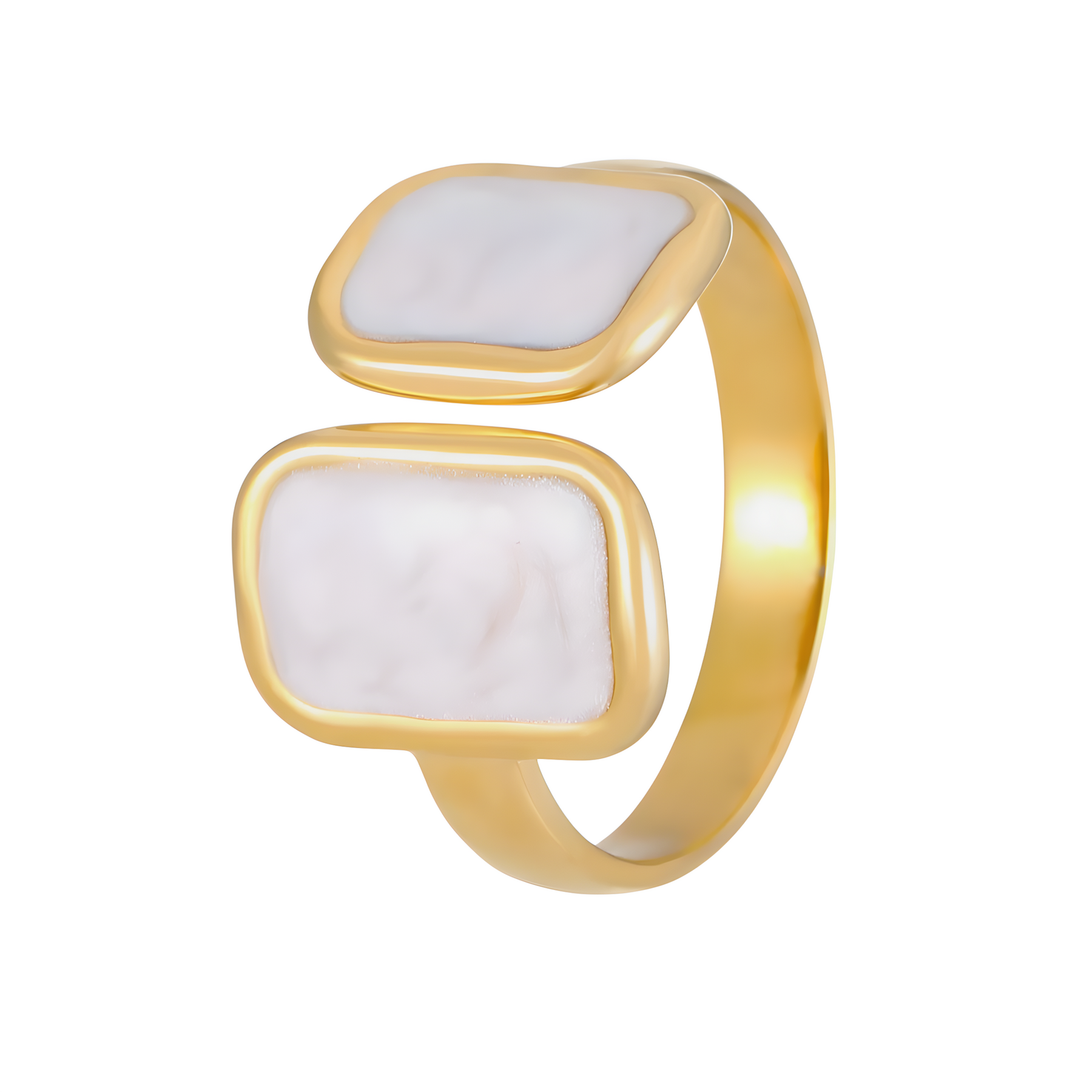 Product code: JUB-RG-007-GOLDSTONE Material: Gold-plated stainless steel Stones: White mother-of-pearl or dark labradorite (rectangular bezel-set) Ring style: Adjustable open band, Nature-Inspired, Minimalist Sizes available: Adjustable US 6–9