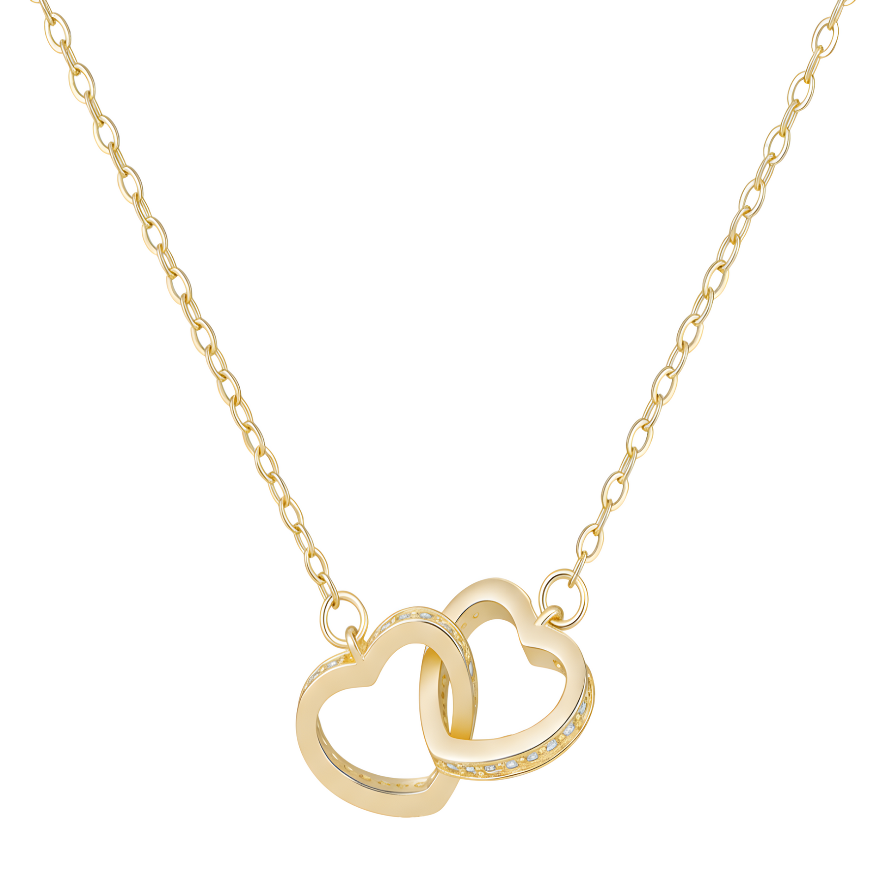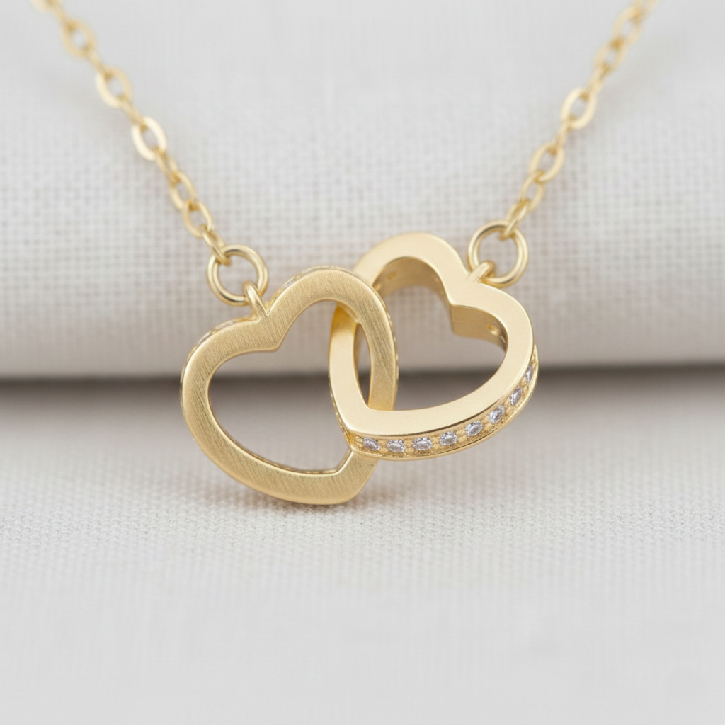 Celebrate love and connection with this Interlocking Double Heart Necklace. Featuring two open hearts adorned with sparkling cubic zirconia stones and finished in warm gold, this elegant necklace symbolizes commitment, unity, and everlasting affection.